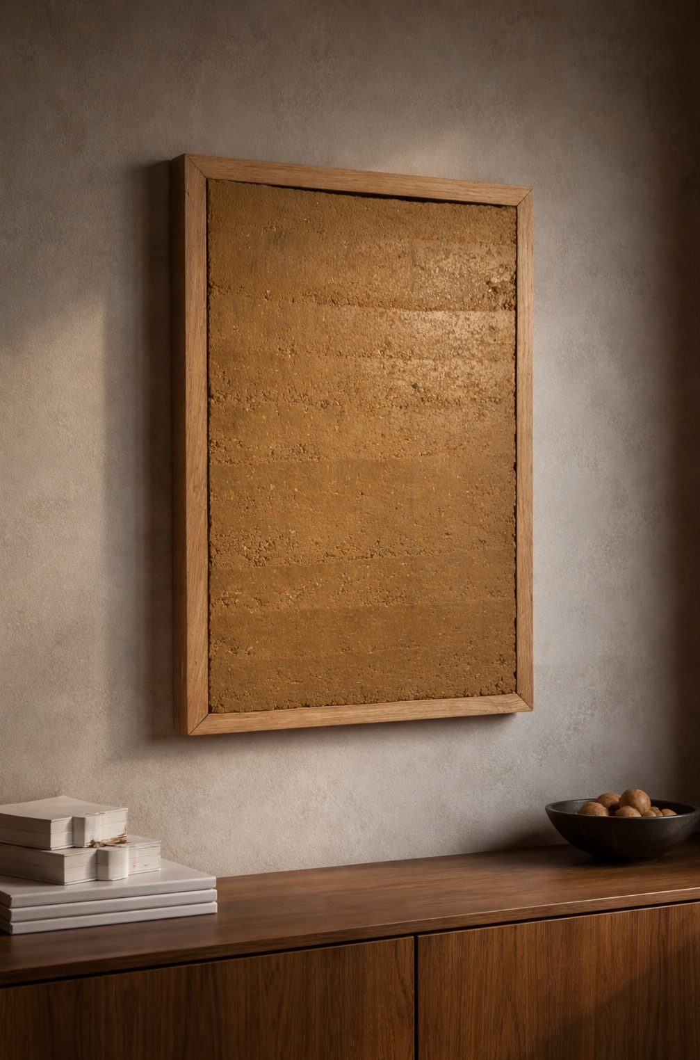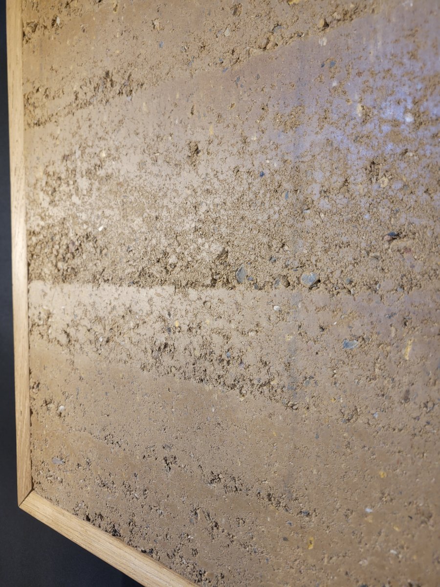 Gerahmtes Wandobjekt aus echtem Stampflehm.